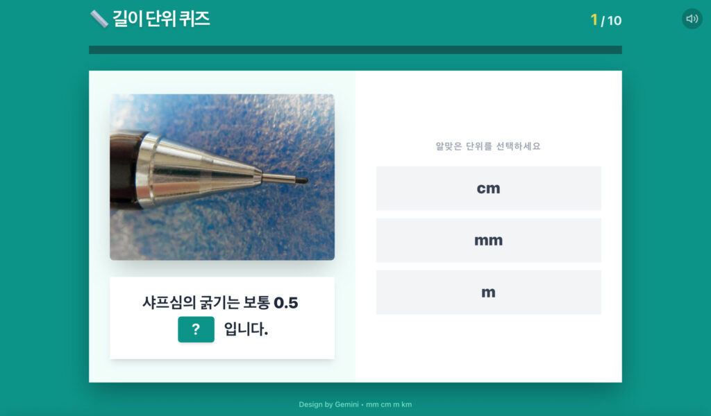 길이의 단위를 언제 사용해야 하는지 다양한 예시를 가지고 연습하는 게임입니다.