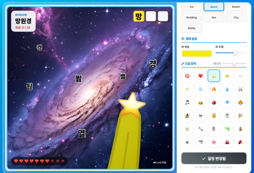 • 즉각적인 피드백: 맞는 글자를 먹으면 긍정적인 효과음과 함께 단어가 채워지고, 틀린 글자를 먹으면 하트가 줄어듭니다. 이러한 즉각적인 피드백은 올바른 철자를 기억하는 데 강력한 강화 기제(Reinforcement)로 작용합니다.