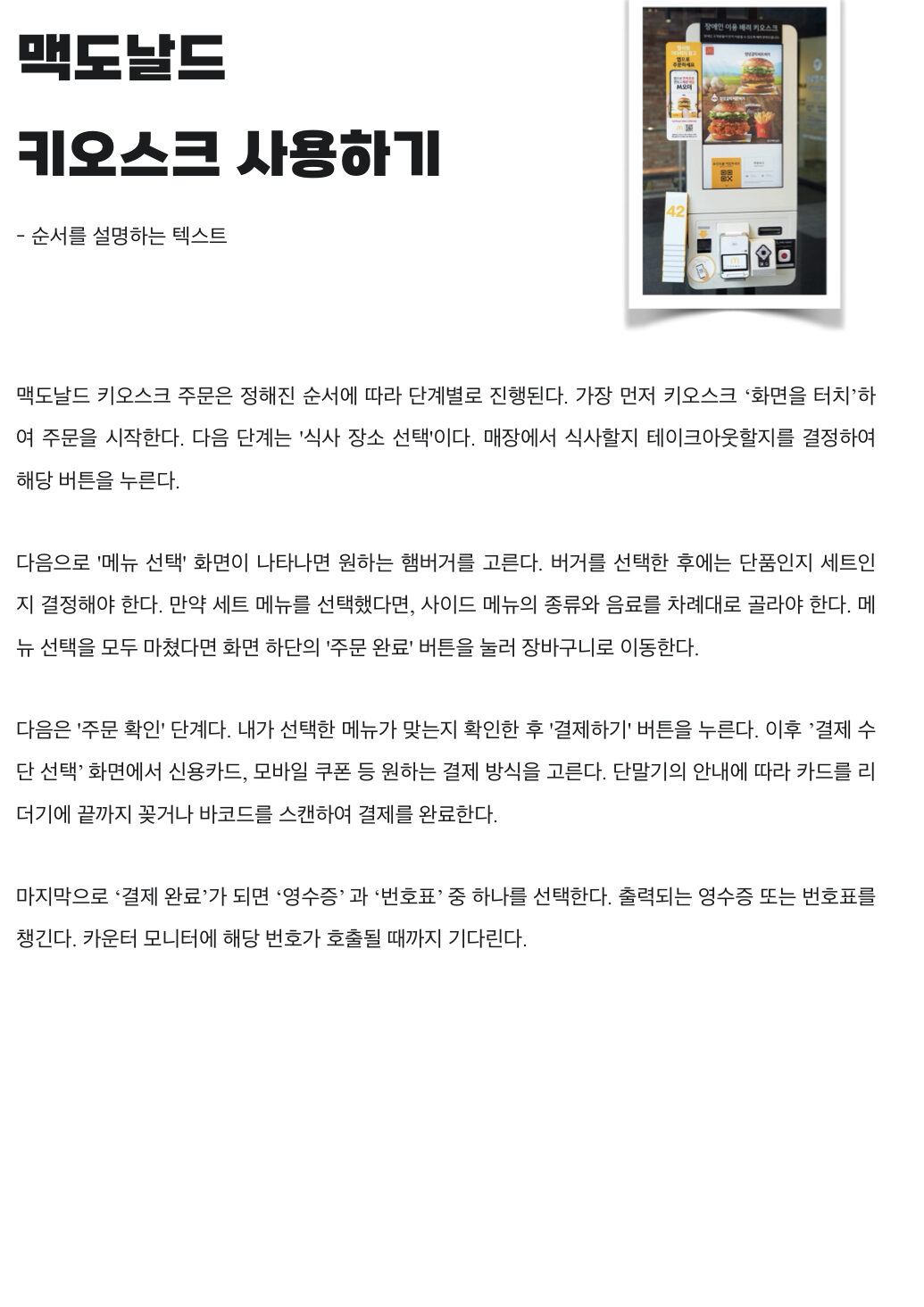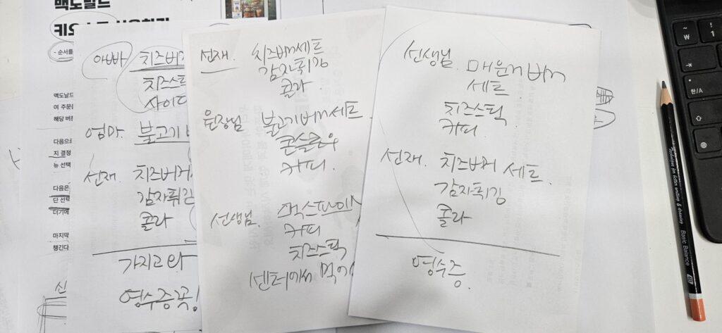 주문서는 다음과 같이 작성해 보세요. ”오늘 점심은 맥도널드에 가서 먹자. 아빠는 치즈버거 세트를 드실꺼야. 사이드 메뉴는 감자튀김과 사이다, 엄마는 불고기 버거 세트인데 치즈 스틱과 커피를 마실게. 너는 먹고 싶은거 네가 선택해. 주문이 끝나면 영수증을 꼭 챙겨줘.“