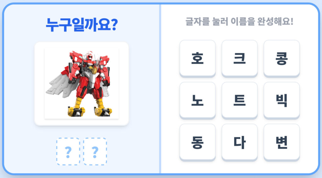 미니특공대 애니멀트론 단어 구성 게임 12월 30, 202512월 30, 2025 작성자: Makadamia 미니특공대 애니멀트론 캐릭터의 이름을 구성해보세요. “볼트, 루시, 새미, 맥스 라이언, 호크, 크로커, 빅콩“ 의 이름이 흩어져 있어요. 모두 모두 찾아서 완성해주세요. 아래 이미지를 클릭하면 게임이 시작되요. 휴대폰 사용시 아래의 이미지를 클릭하세요. Post Views: 63
