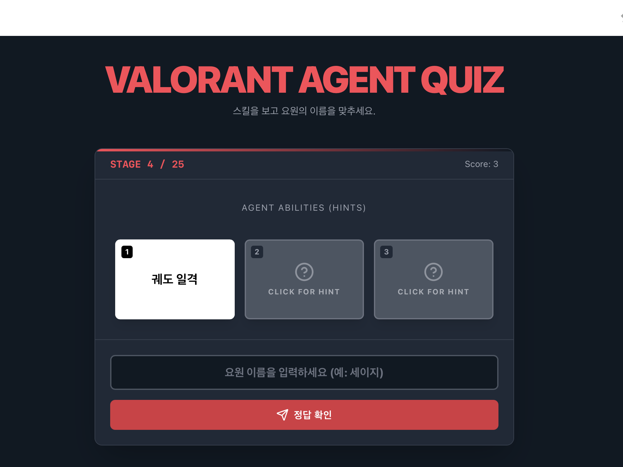 발로란트 요원 28명은 각각 4개씩의 특별한 능력을 가지고 있습니다. 스킬을 보고 요원이 누구인지 답을 하는 게임인데 힌트를 하나만 주고, 나머지는 감추어둔 아이디어가 매우 돋보입니다.