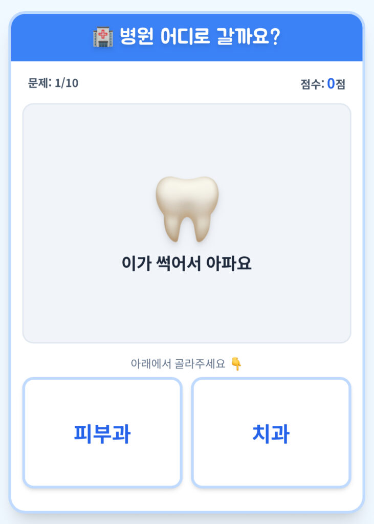 병원, 어디로 갈까요? 12월 21, 202512월 18, 2025 작성자: Makadamia 병원 진료과 선택을 연습할 수 있는 게임입니다. 내과 / 소아청소년과 / 외과 / 이비인후과 안과 / 치과 / 피부과 다양한 증상을 보고 알맞은 진료과를 터치합니다. 아래 이미지를 클릭하면 게임이 진행됩니다. Post Views: 59