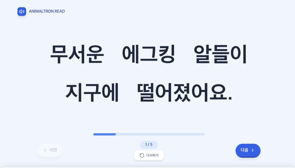 애니멀트론 문장 읽기 (에그킹) 2월 26, 20262월 26, 2026 작성자: Makadamia 미니특공대 애니멀트론 1화를 5문장으로 정리하였습니다. 각 문장을 손가락으로 짚으면서 읽어보세요. 손가락으로 클릭하면 단어의 색깔이 변하고, 음성 지원이 나옵니다. 아래 이미지를 클릭하면 앱이 시작됩니다. Post Views: 24