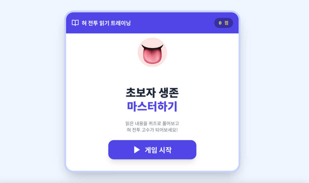 아이들이 좋아하는 로블록스(Roblox) 게임인 ‘혀 전투(Tongue Battles)’를 소재로 한 문해력 향상 학습 게임입니다.