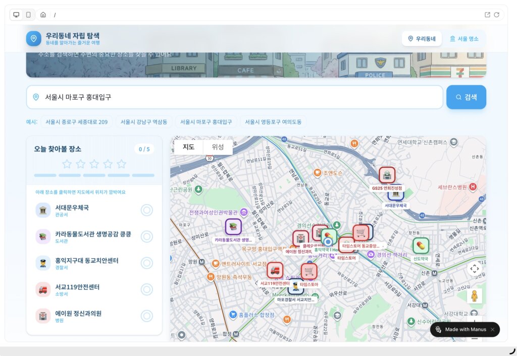 - 위치 기반 탐색: 주소 입력 시 반경 1km 내 주요 장소를 지도에 표시하여 실제 위치를 익힙니다.